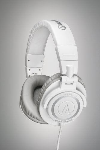 With the ATH-M50WH professional studio monitor headphones (white color; coiled cable), Audio-Technica has achieved an exceptionally accurate response and long-wearing listening comfort. Designed especially for professional monitoring and mixing, these studiophones feature an efficient collapsible design for space-saving portability and storage. Circumaural ear pieces swivel 180° for easy one-ear monitoring and luxuriously padded ear cushions create an outstanding seal for maximum isolation. The adjustable headband is generously padded for ultimate comfort during long mixing sessions. A coiled cable at the left earpiece terminates to a gold-plated mini-plug with included screw-on ¼" adapter.